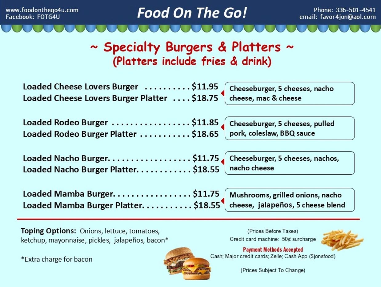 Food On The Go is excited about these two menu items. You asked and we're going to deliver. Introducing our loaded deep fried tortilla bowls (beef, chicken, pulled pork, pulled chicken, grilled chicken, fried chicken, chili, fish, and our plain Jane veggie bowl).